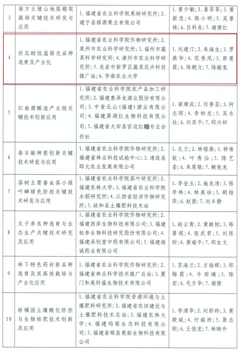 由泉州市农科所作为第二完成单位申报的“丝瓜耐低温弱光品种选育及产业化”获得福建省农科院科学技术奖——科技创新一等奖。蔬菜学科团队参与福建省农科院作物研究所组建的攻关团队,从基因挖掘与机制解析、特异材料创制、育种技术创新、高效栽培等绿色防控措施着手,为丝瓜产业创制新品种,保障种业安全,促进品种更新换代,产业绿色健康发展。