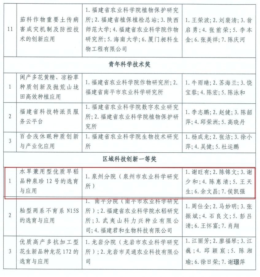 奖项一:泉珍12号“水田+旱地”两用及配套栽培技术推广全省,摘得区域科技创新一等奖