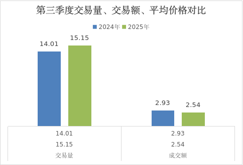 今年第三季度交易量达15.15万吨,比去年同期交易量14.01万吨上涨了8.12%。第三季度交易额2.54亿元,比去年同期交易额2.93亿元下降了13.09%。在整体消费需求保持韧性的同时,市场平均交易价格的下行是导致交易额收缩的主导因素。