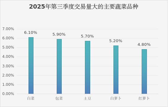 从交易结构看,白菜(6.1%)、包菜(5.9%)、土豆(5.7%)、白萝卜(5.2%)、红萝卜(4.8%) 等大宗品种继续占据交易主体,其稳定的供应和亲民的价格保障了市场的基本盘。