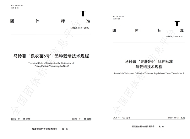 11月20日,由泉州市农业科学研究所独立起草的《马铃薯‘泉农薯6号’品种栽培技术规程》(T/MNJX 019-2025)和《马铃薯‘泉薯5号’品种标准与栽培技术规程》(T/MNJX 020-2025)两项团体标准,经福建省农村专业技术协会正式发布,于2025年11月21日起正式实施。此举标志着泉州加工型马铃薯品种种植告别传统“经验依赖”,迈入“标准引领”的规范化发展新阶段。