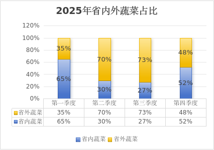 季节分布特征:第一季度省内气候适宜,本地蔬菜集中上市,占比高达65%,有效平抑节日期间价格波动;第二季度受高温天气影响,叶菜类产量下降,供应占比骤降至30%;第三季度遭遇持续降雨,菜田积水导致采收受阻,叠加“青黄不接”期影响,省内占比进一步降至27%的全年低点;第四季度气温回落,本地蔬菜复产叠加北方寒潮导致省外供应收紧,省内占比回升至52%,保障冬季市场供应。
