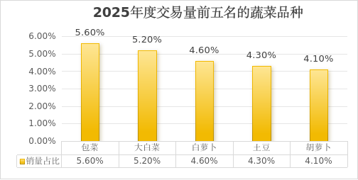 2025年,包菜、大白菜、白萝卜、马铃薯、胡萝卜稳居全年销量前五,五大类耐储、平价蔬菜稳居销量前五,合计占比超23.8%,构成了市场交易的“基本盘”,有效适配了当前注重性价比的消费需求。